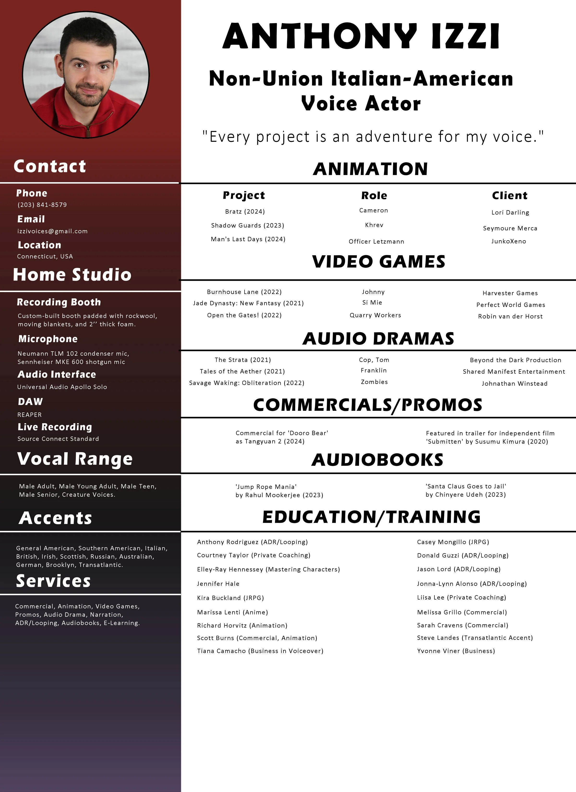 Welcome to my website! I’m Anthony Izzi (fun last name since it’s the same backwards), an Italian-American voice actor located in Connecticut. Plenty comfortable behind a computer--and especially behind a microphone. I have a history of studying theatre in my college years. I’m conversational In Italian and Spanish. A martial artist, photographer, author, gym rat, all sharing the same passion in my voice acting life. Show me the script and I’ll leave you smiling. Let’s go!